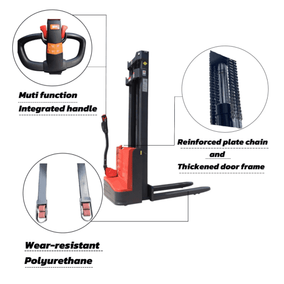 Walk-Behind Design: The operator walks behind or alongside the stacker while controlling it. This design provides excellent visibility and maneuverability, especially in tight spaces.
