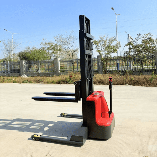 This refers to the electric-powered mechanism that enables the operator to walk alongside or behind the stacker while it moves and lifts loads. The electric drive makes it easier to move heavy loads without manual pushing or pulling, which increases efficiency and reduces the physical strain on the operator.