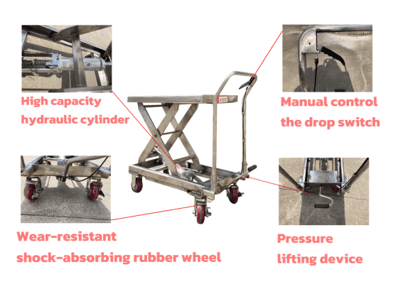 - Scissor Lift Mechanism:The trolley features a scissor lift system, where a series of crossed metal arms (the “scissor”) are expanded or contracted to raise or lower the platform.